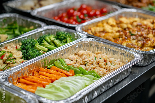Food stored in a disposable aluminum container tray, perfect for meal prep or takeout. The simple, practical design makes it ideal for convenient food storage and transport.