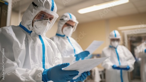 Food technologists in protective gear reviewing a batch of raw ingredients for production, with machinery in the background