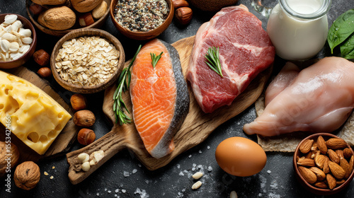 Food that is high in protein. veggies, meat, fish, poultry, nuts, and eggs. The idea of balanced eating and healthful eating. low-carb and ketogenic diet. View from above