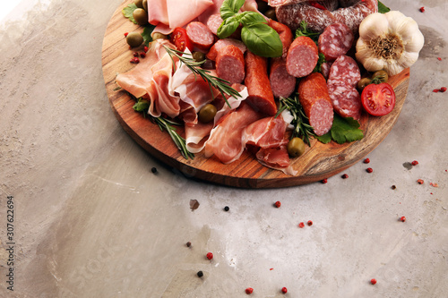 Food tray with delicious salami, pieces of sliced prosciutto crudo, sausage and basil. Meat platter