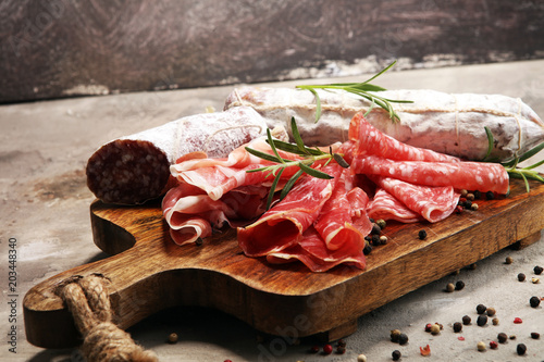 Food tray with delicious salami, prosciutto crudo, fresh sausages and herbs. Meat platter with selection