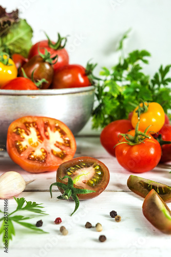 Food vegetables tomatoes of different varieties in a bowl and on a white wooden table. Rustic still life