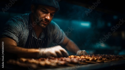 Food vendor preparing skewers in a dimly lit kitchen