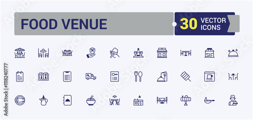 Food Venue line web icon set. Containing menu, bottle, collection, eat, design, spoon, chicken, vector. Thin linear style icons. Solid line editable vector illustration.