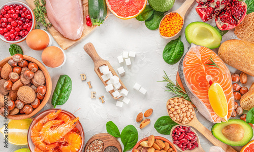 Food with foods high in vitamins, minerals, antioxidants, smart carbohydrates, Diabetic sugar free diet, top view
