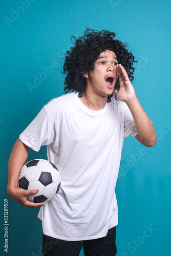 Football fan cheer up supporting favorite team while holding soccer ball and doing hand gesture near mouth scream aside
