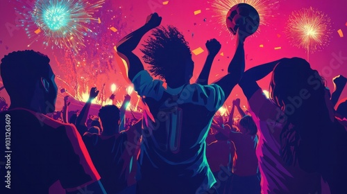 Football victory vector, featuring a team celebrating a win with fireworks and fans, triumphant atmosphere