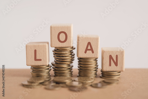 For Loan business finance economy commercial real estate investments concept, LOAN text on wooden cube blocks above and stack of coins