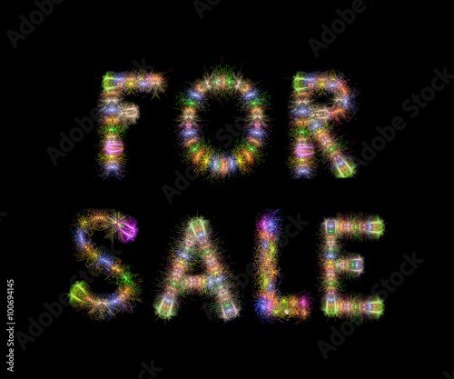 FOR SALE text colorful sparkling fireworks horizontal black back