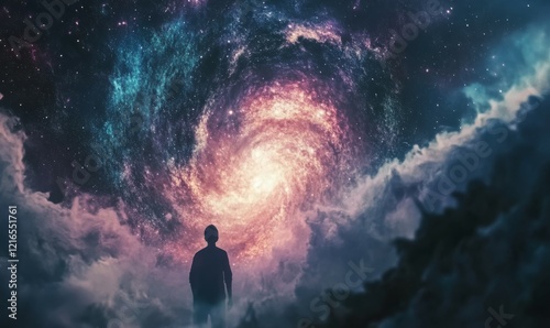 Forced perspective of Jupiter dominating stardust and nebulae background