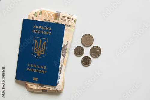 Foreign Ukrainian passport and hryvnia lie next to Russian rubles on a white background, economy and tourism, sanctions in Russia
