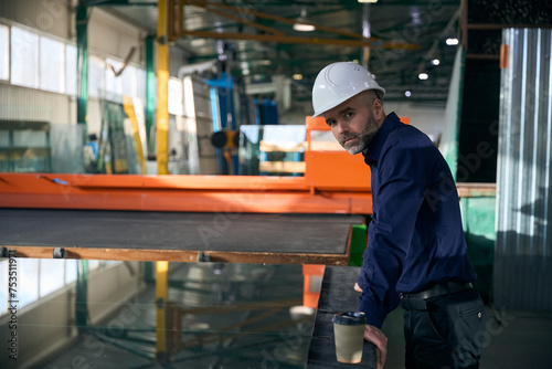 Foreman in safety helmet at workplace in window production facility