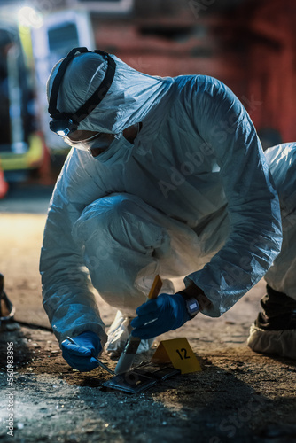 Forensics Expert Using Professional Equipment on Crime Scene to Retrieve Traces and Fingerprints. Focused Specialist Working on a Wallet Believed to be Relevant Evidence for the Case