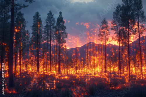 Forest ablaze, flames consume trees, smoke billows up, a red-hot inferno spreads rapidly, threatening the thick woodland.