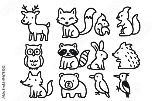Forest Animal Icons. Forest animals doodle icon set: hand drawn icons of deer, fox, owl, raccoon, hedgehog, squirrel, wolf, rabbit