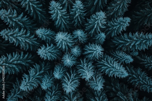 Forest canopy overhead view. Detailed, textured evergreen trees