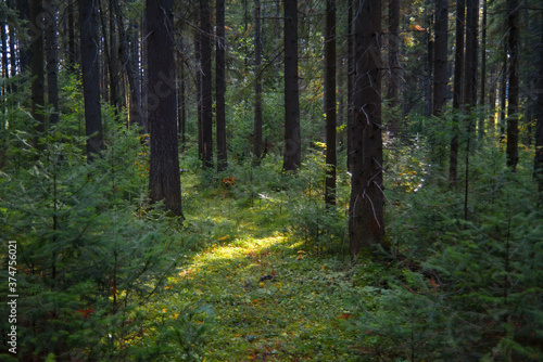 Forest closeup, beautiful summer landscape, sunlight shines through branches, trees with shadows.