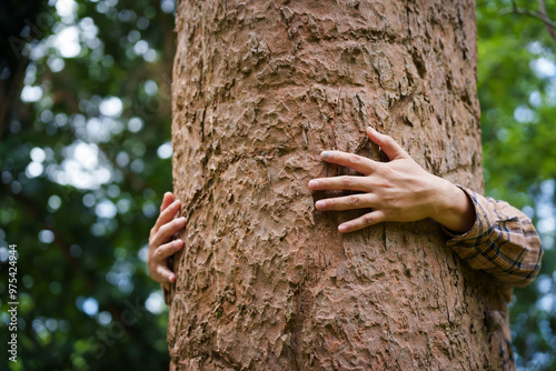 Forest conservationist gentle hugs tree in sunny park, deep care and respect for nature. Their hands embrace the trunk, reflecting commitment to environmental protection and sustainable ecosystems.