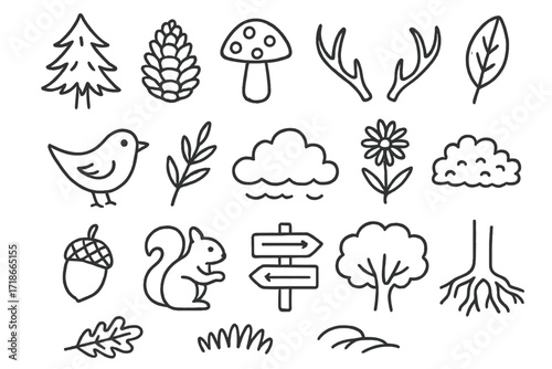 Forest Doodle Icons. Hand-drawn doodle illustration Forest-inspired graphics [tree, pinecone, mushroom, deer antler, leaf, bird, branch, fog icon, wildflower,