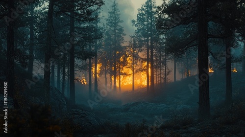 Forest Fire at Dusk: A Fiery Sunset Through the Pines