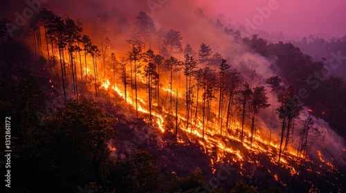 Forest Fire Burning on Mountain Slope with Smoke and Flames