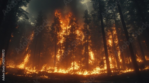 Forest fire engulfing tall trees, smoky sky, danger