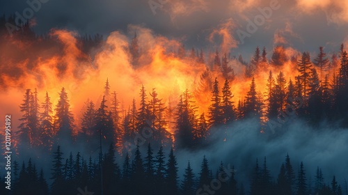 Forest fire spreads rapidly through tall trees during early evening hours