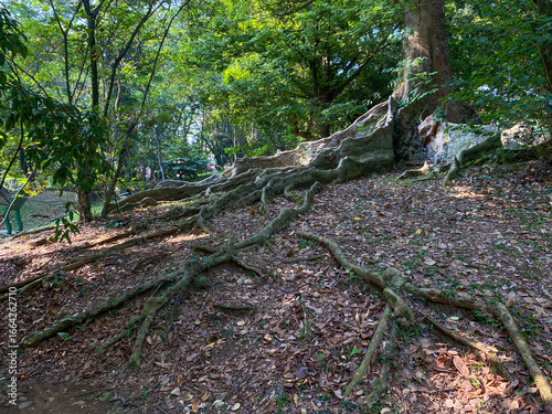 Forest floor with tree root, scattered dry leaves and moss. Koompassia excelsa tree big root
