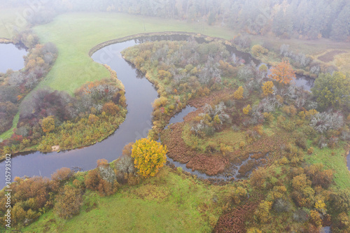 Forest in autumn colors. Colored trees and a meandering blue river. Red, yellow, orange, green deciduous trees in fall. Peetri river, Estonia, Europe