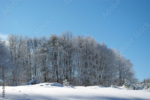 Forest in winter with beech trees, blue sky and white snow