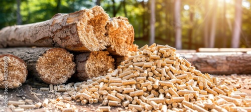 Forest landscape with fallen logs and sawdust transforming into wood pellets pile