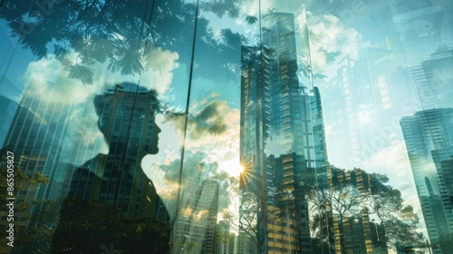 forest merging with tall building close up, focus on, copy space, striking visuals, Double exposure silhouette with architectural impact