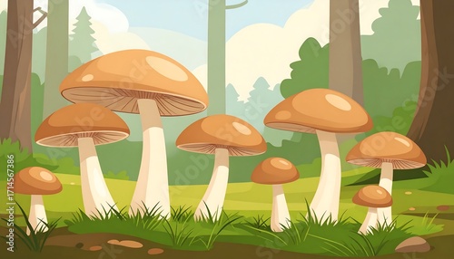 Forest scene with many mushrooms