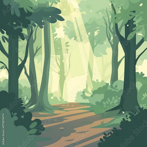 Forest trail with sunlight, dappled light through trees, flat design illustration
