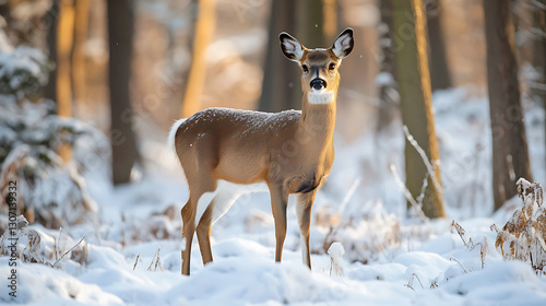 forest wildlife in winter featuring graceful female deer standing in snow representing peaceful moment of nature calm and outdoor seasonal beauty