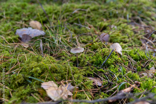 forest with mushrooms and yellowing foliage of trees, wildlife with plants, shrubs and mushrooms in the autumn season