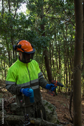 forest worker drilling tree by injecting chemical substance to kill trees in the forest