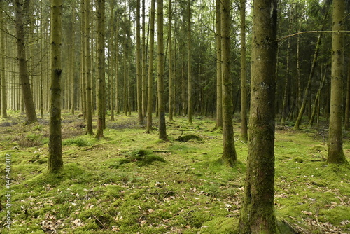 Forêt de conifères aux troncs fins au sommet d'une colline à Vielsalm (Bastogne)