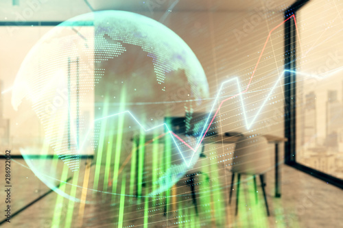 Forex chart hologram with map and minimalistic cabinet interior background. Double exposure. International business concept.
