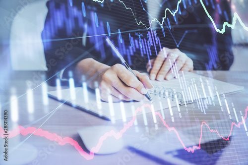 Forex graph on hand taking notes background. Concept of research. Multi exposure