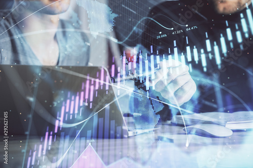 Forex graph with businessman typing on computer in office on background. Concept of analysis. Double exposure.