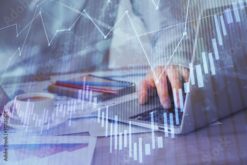 Forex graph with businessman working on computer in office on background. Concept of hardworking. Multi exposure.