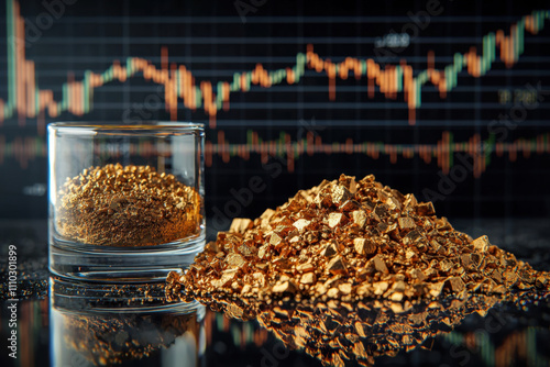 Forex, XAUUSD, A close-up of gold nuggets in a glass and a pile, with a financial chart background, symbolizing wealth and investment.