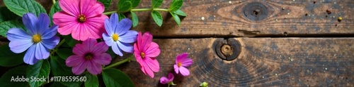 Forget me nots and eucalyptus on a reclaimed wooden table, nature, forget