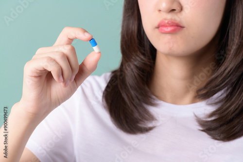 Forget taking medicine. Confused woman holds head and looks at pills on green background. Asian woman forget to take medicine, miss medication dose, and think of next prescription with a pill in hand