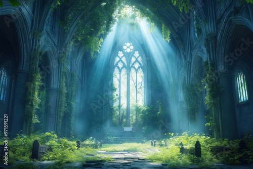 Forgotten Cathedral: Nature reclaims a grand, gothic cathedral, bathed in ethereal light streaming through stained glass windows. The once hallowed halls are now overgrown with lush greenery