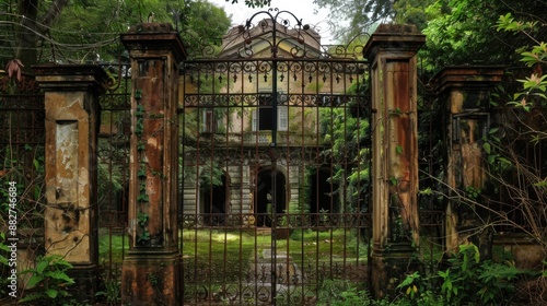 Forgotten Elegance: Rusty Iron Gate of Abandoned Mansion Enveloped in Overgrown Vines
