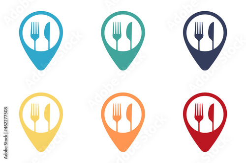 Fork, knife and plates icons set, menu logo, cutlery silhouette. Map label. Vector illustration.