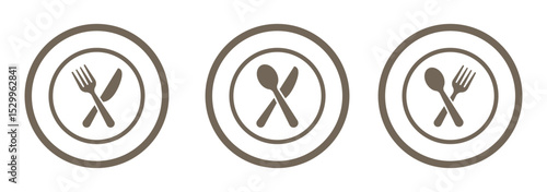 Fork, knife, plate and spoon. Menu symbol. Restaurant icon. Food, plate, fork, knife, spoon, cutlery icon set. Vector