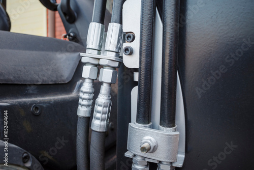 Fork lift truck. Close-up of industrial machine hydraulic hoses and connectors.